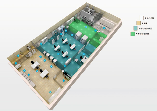 三強(qiáng)醫(yī)械為消毒供應(yīng)中心設(shè)計(jì)了四個(gè)區(qū):1、去污工作區(qū) 2、檢查包裝滅菌工作區(qū) 3、無(wú)菌物品存放工作區(qū) 4、辦公輔助區(qū)。 整個(gè)流程分布合理,四流(人流、物流、污染物品流、無(wú)菌物品流)不逆流,不交叉,流程清洗合理。